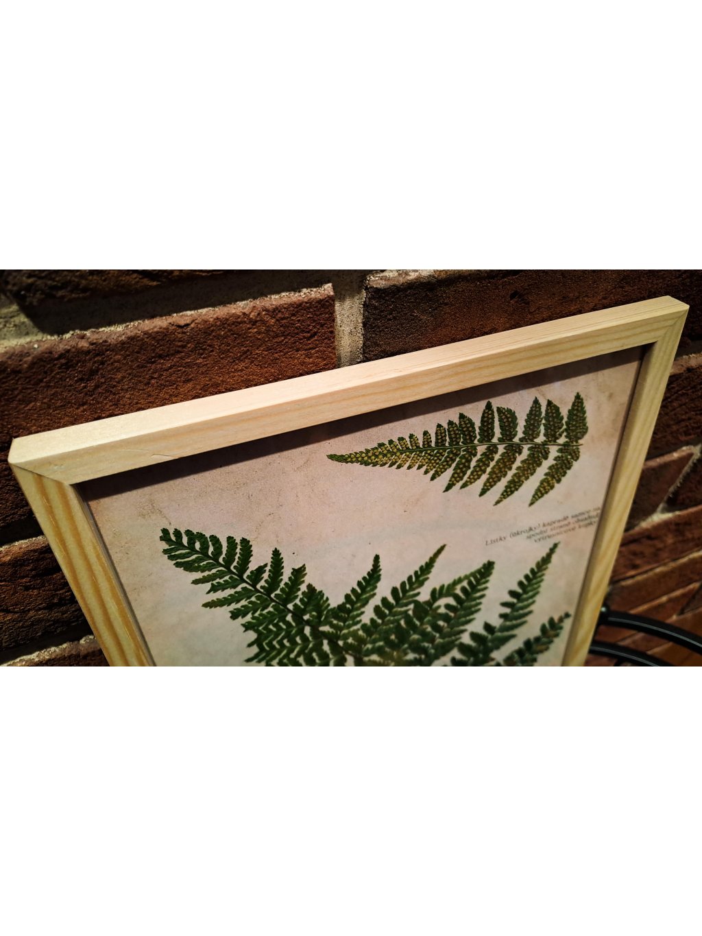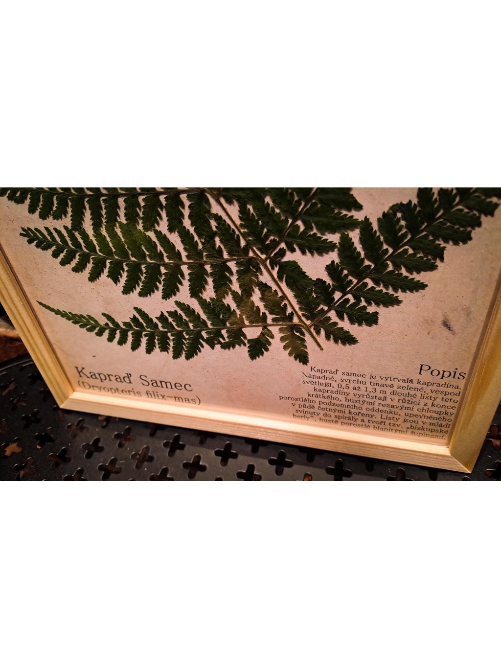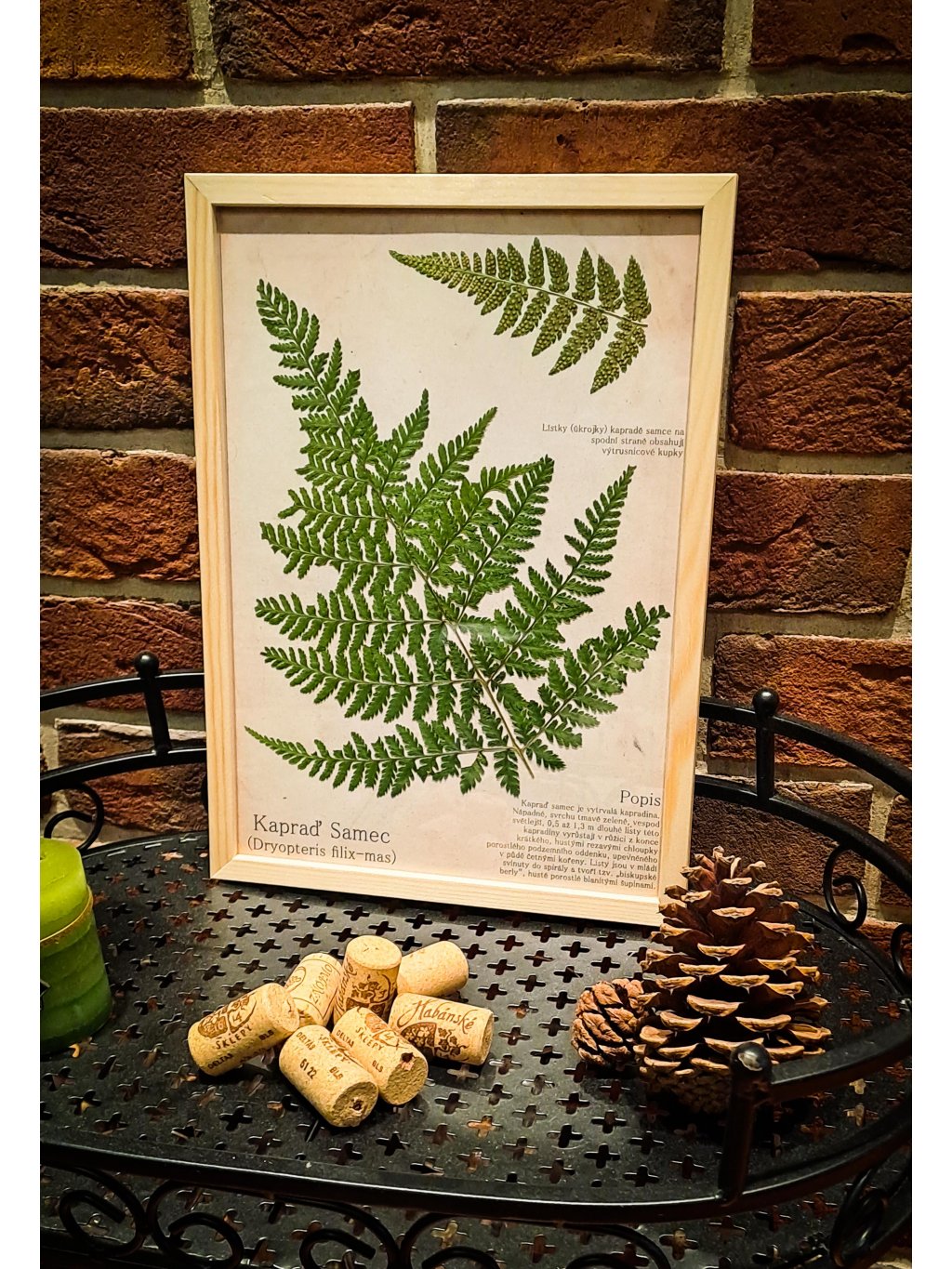Vždy jedinečný kus kapradiny, vylisovaný a vložený do dřevěného rámečku a překrytý krycím sklem. Každý kus naprostý originál, včetně umístění textu, podle velikosti a rozmanitosti rostlinky. V pozadí je umístěn krátký popis daného druhu.