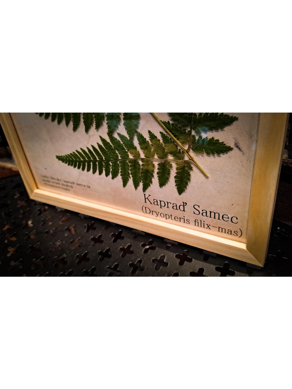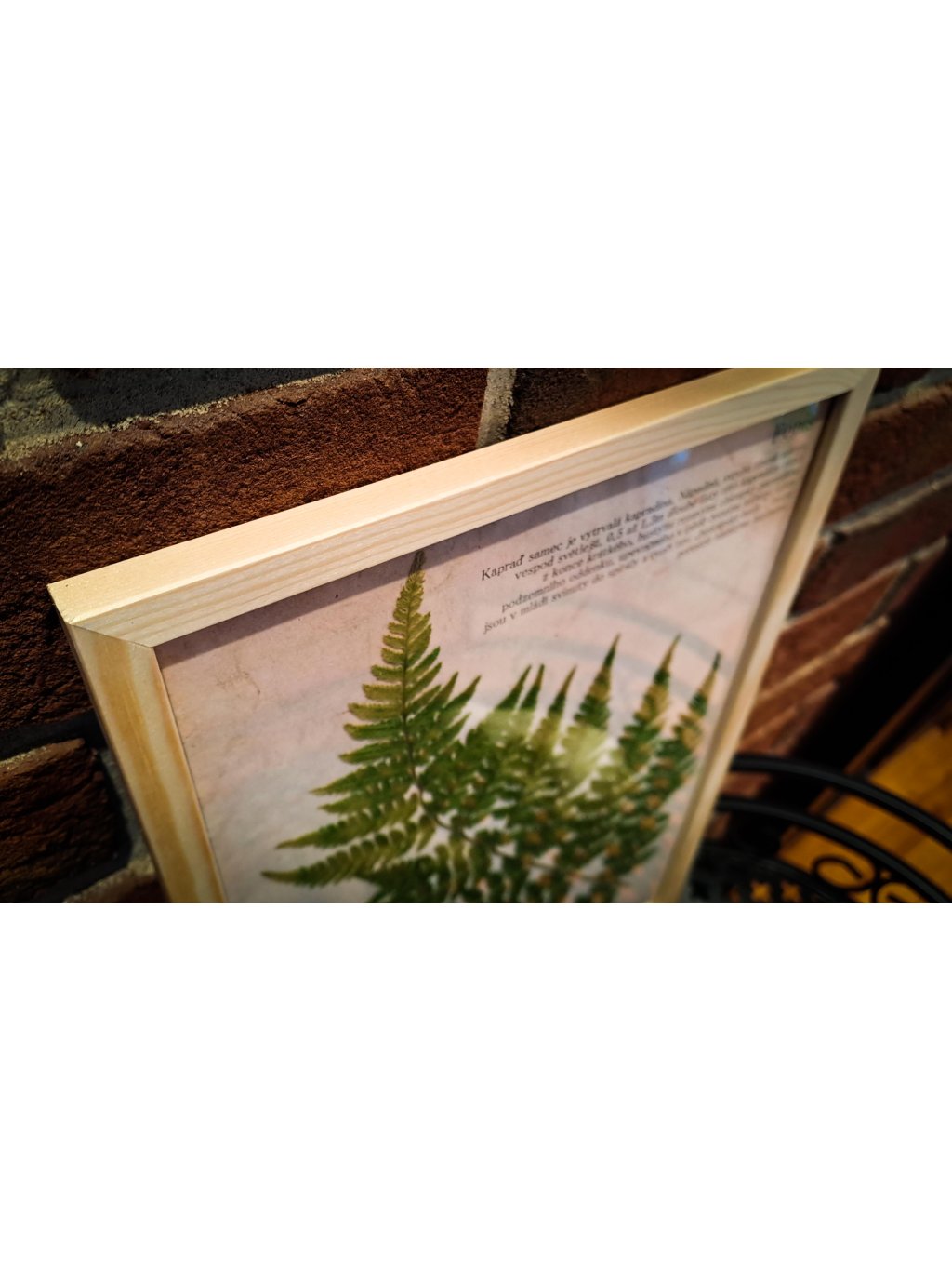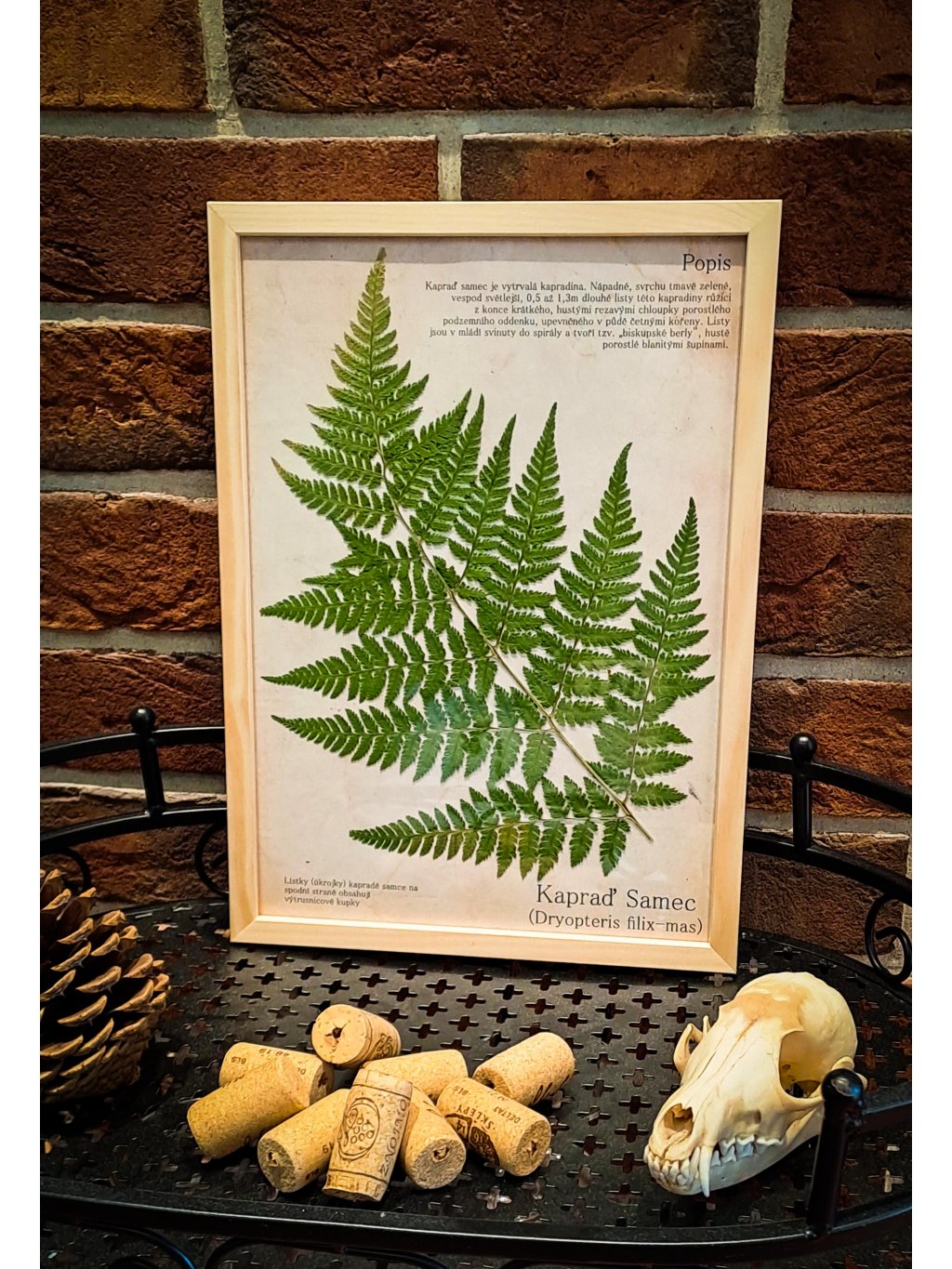 Vždy jedinečný kus kapradiny, vylisovaný a vložený do dřevěného rámečku a překrytý krycím sklem. Každý kus naprostý originál, včetně umístění textu, podle velikosti a rozmanitosti rostlinky. V pozadí je umístěn krátký popis daného druhu.
