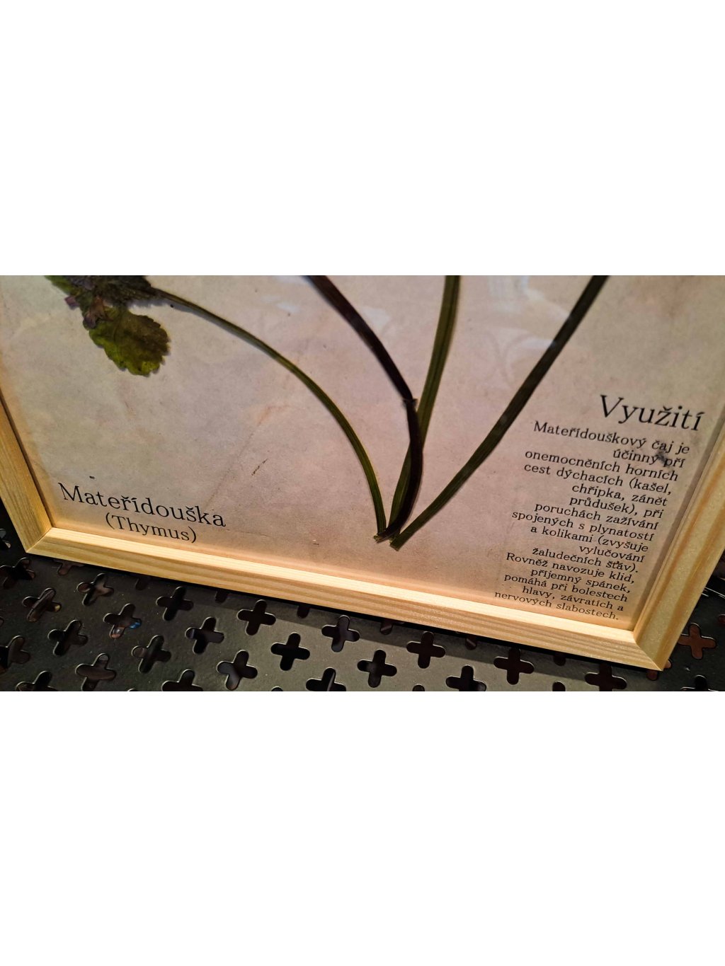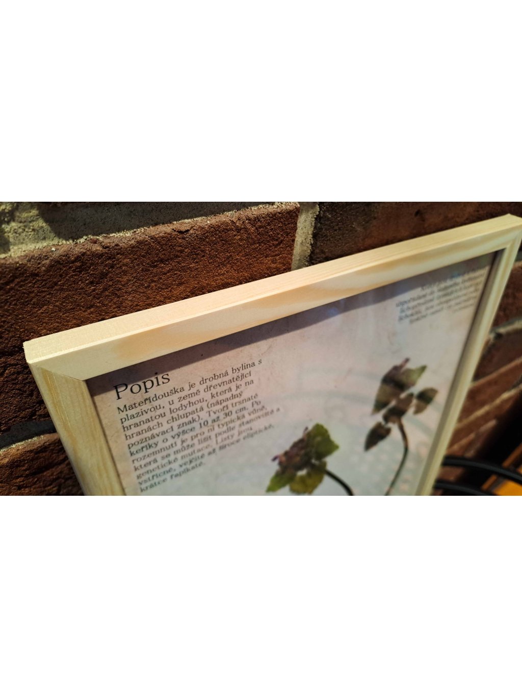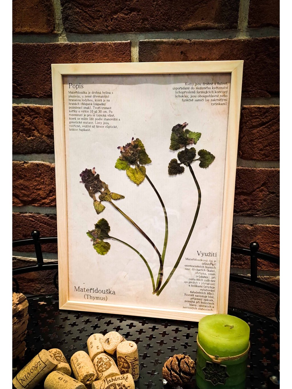 Vždy jedinečný kus Mateřídoušky, vylisovaný a vložený do dřevěného rámečku a překrytý krycím sklem. Každý kus naprostý originál, včetně umístění textu, podle velikosti a rozmanitosti rostlinky. V pozadí je umístěn krátký popis daného druhu.