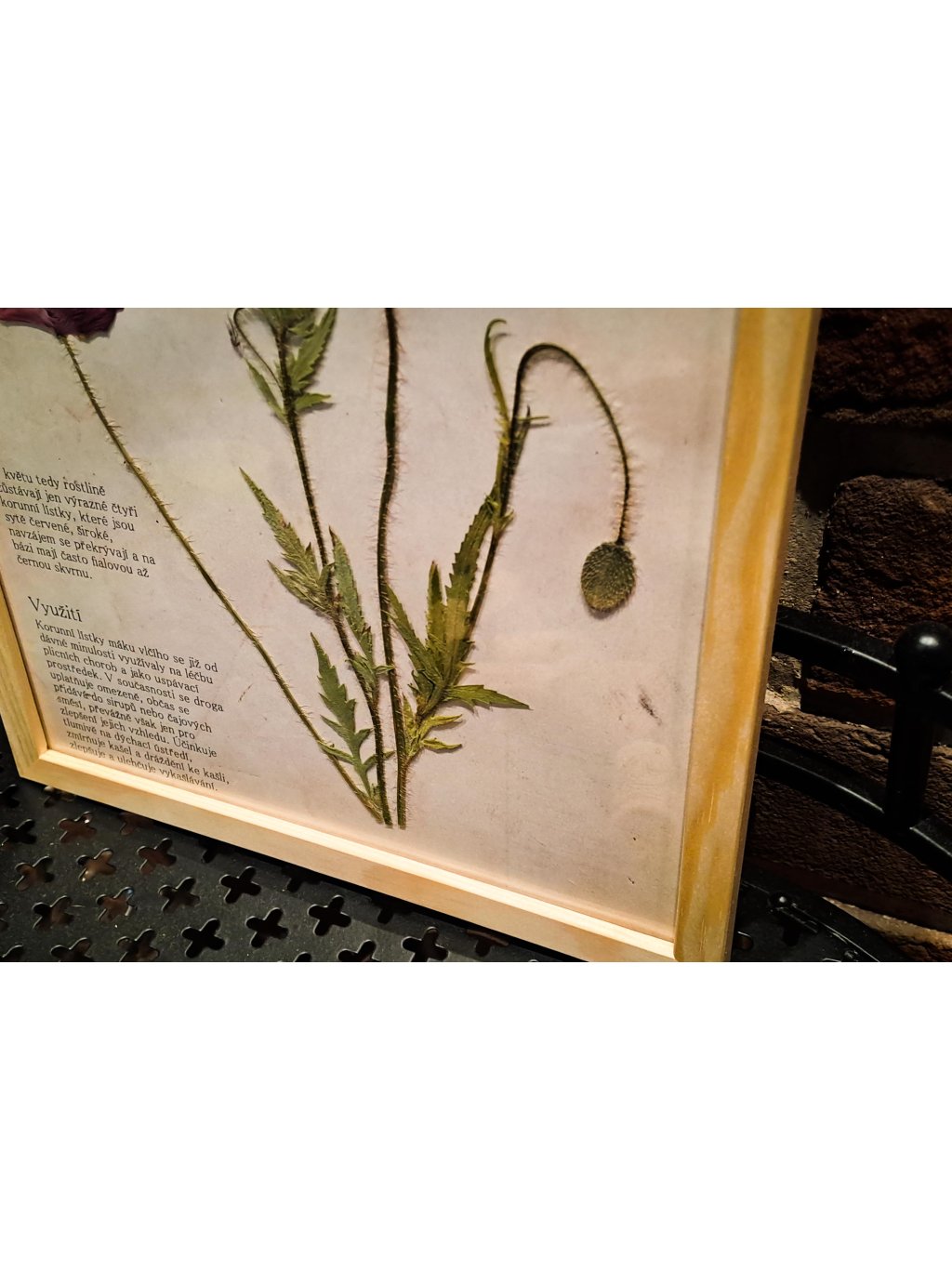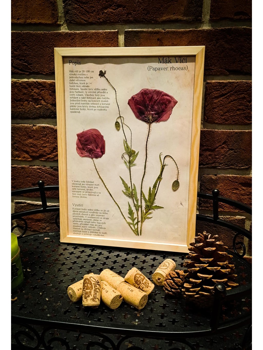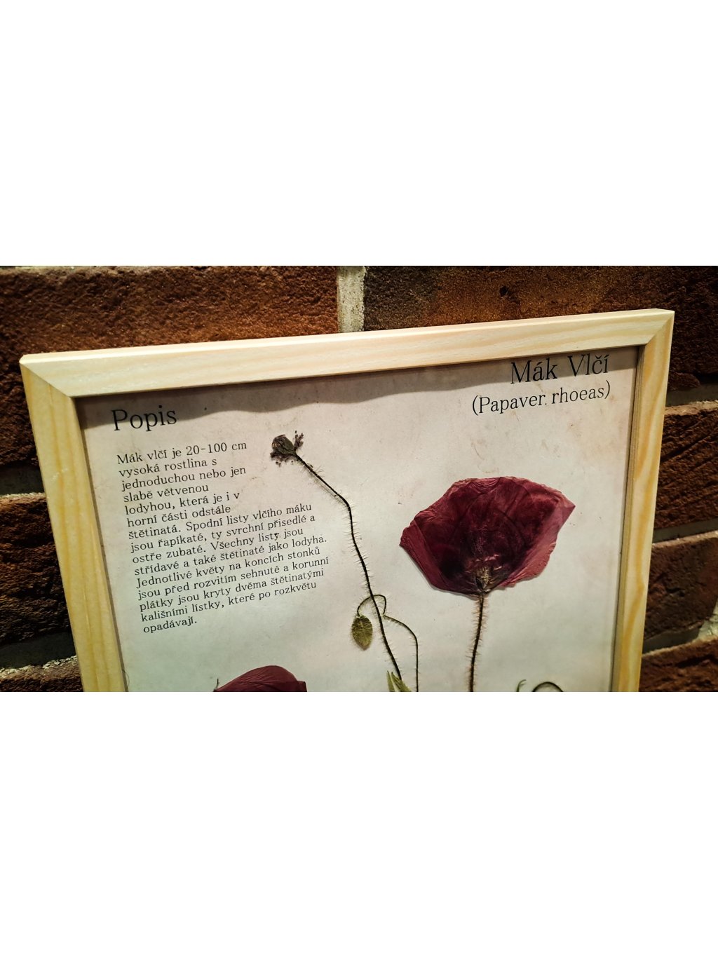 Vždy jedinečný kus Vlčího máku, vylisovaný a vložený do dřevěného rámečku a překrytý krycím sklem. Každý kus naprostý originál, včetně umístění textu, podle velikosti a rozmanitosti rostlinky. V pozadí je umístěn krátký popis daného druhu.