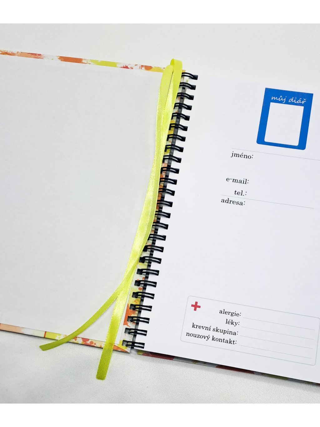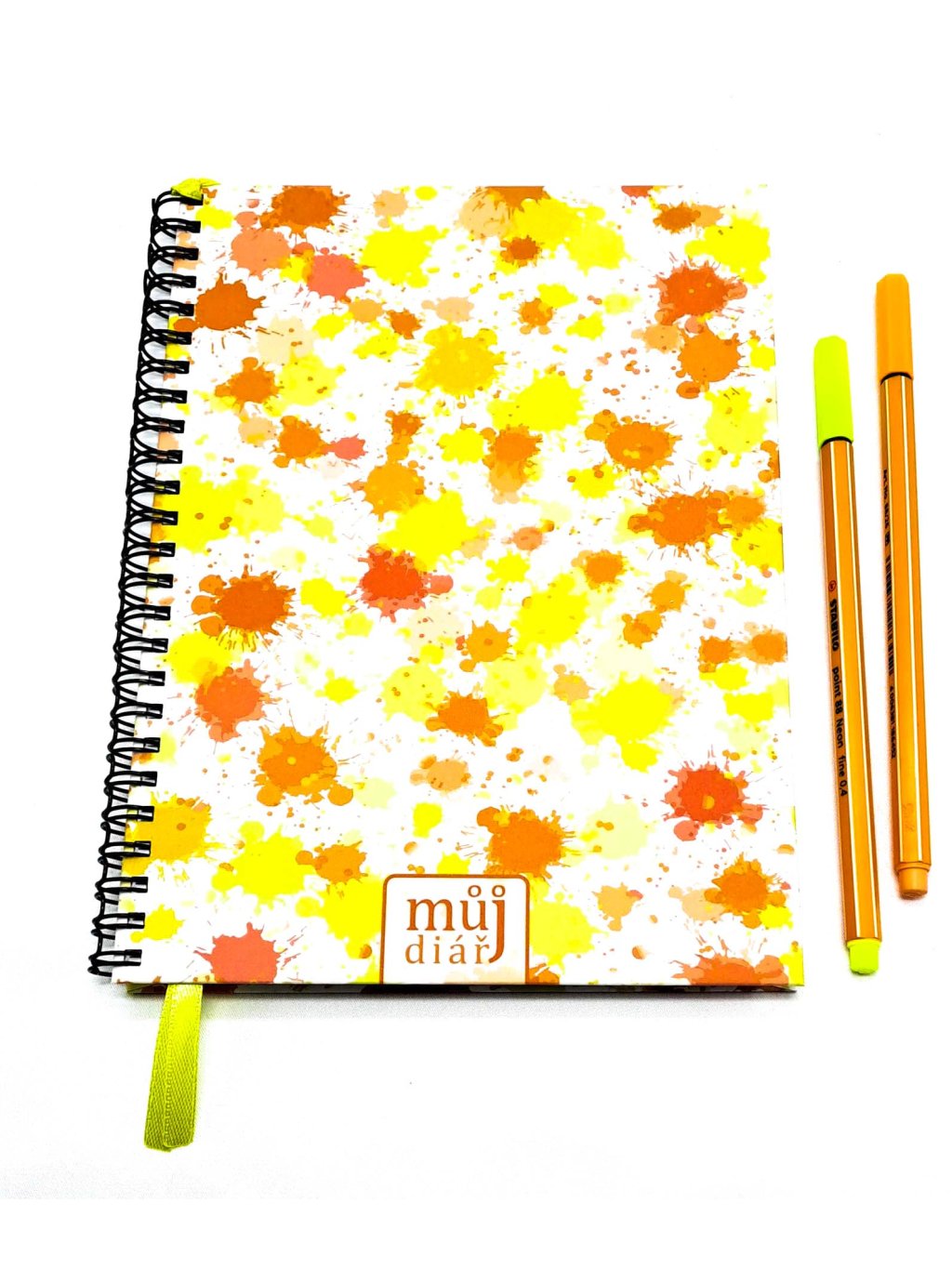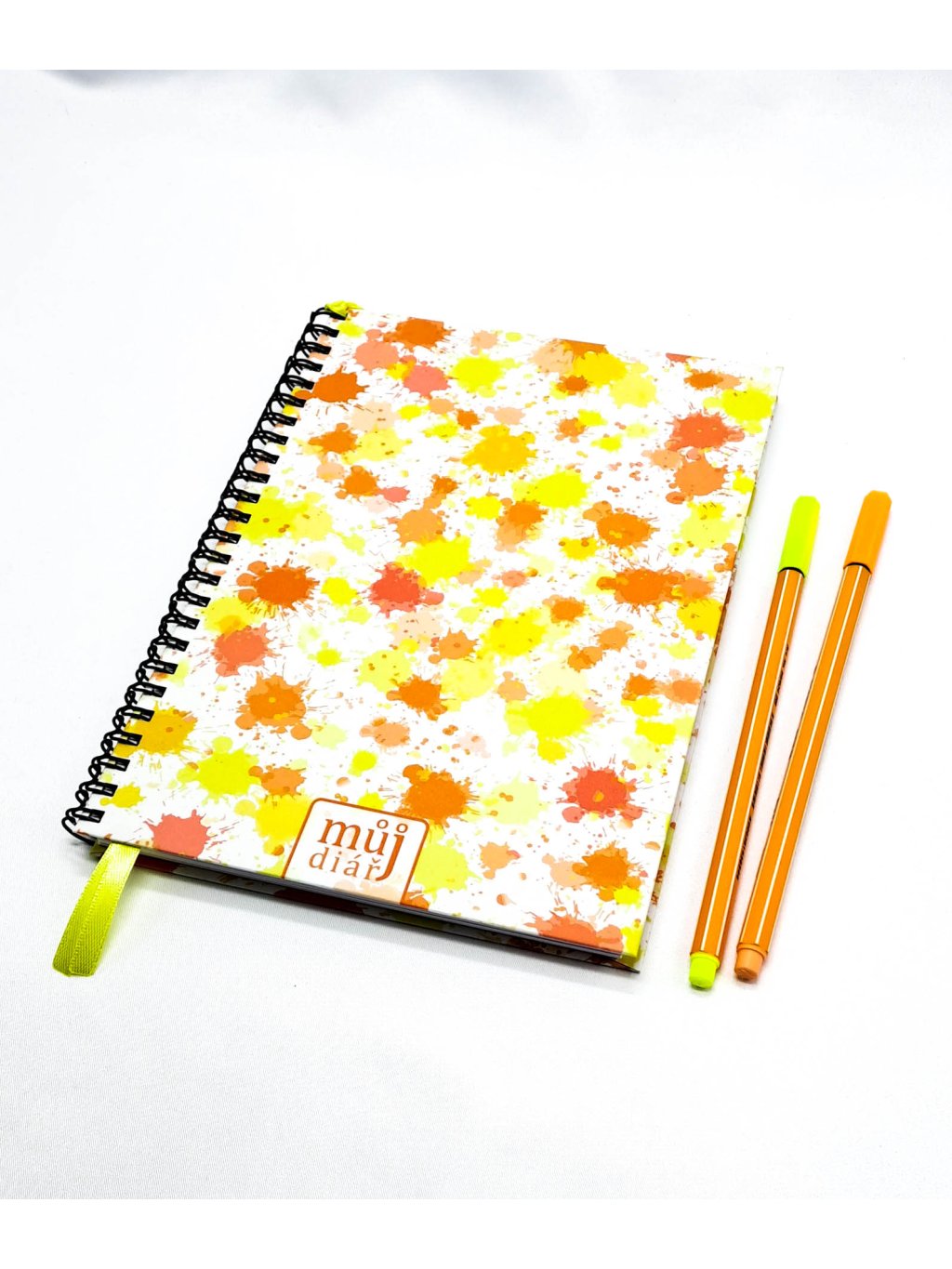 Ručně vyrobený diář s autorskými motivy na přední straně. Desky jsou z 900g tvrdého kartonu. Vnitřní stránky, ze 120g papíru, jsou vloženy do kroužkové vazby.