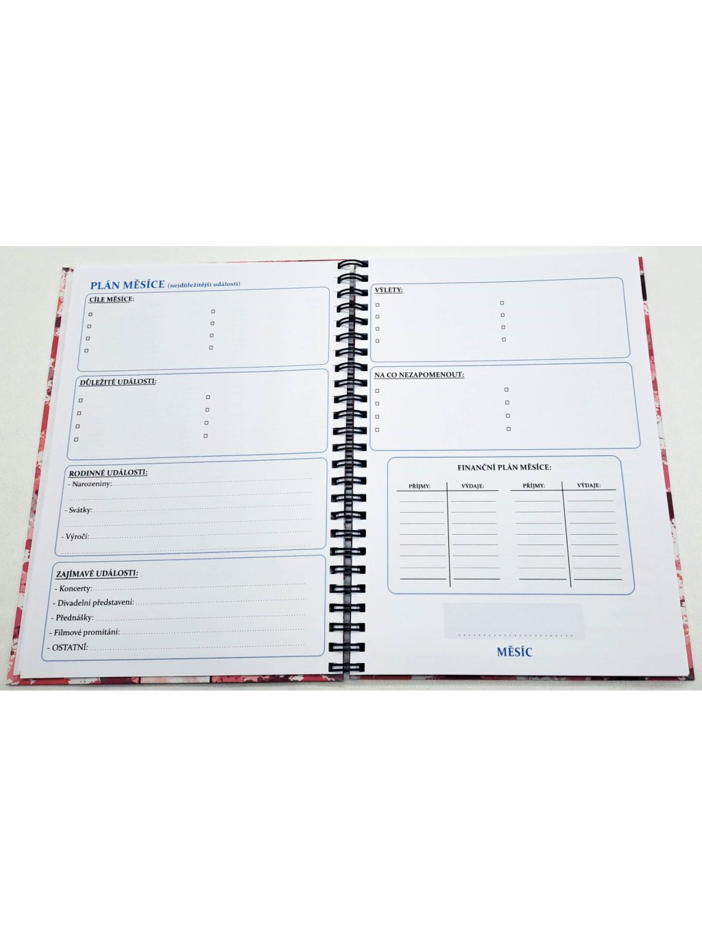 - PLÁN MĚSÍCE - dvoustrana věnovaná následujícímu měsíci (cíl měsíce, důležité události, výlety, finanční plán a mnoho dalšího)