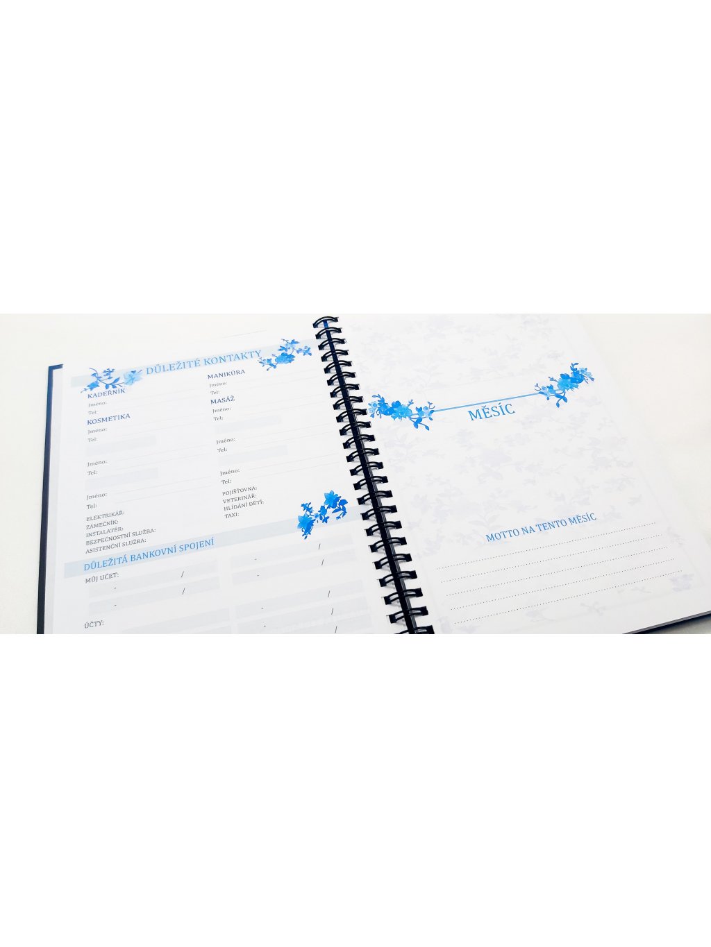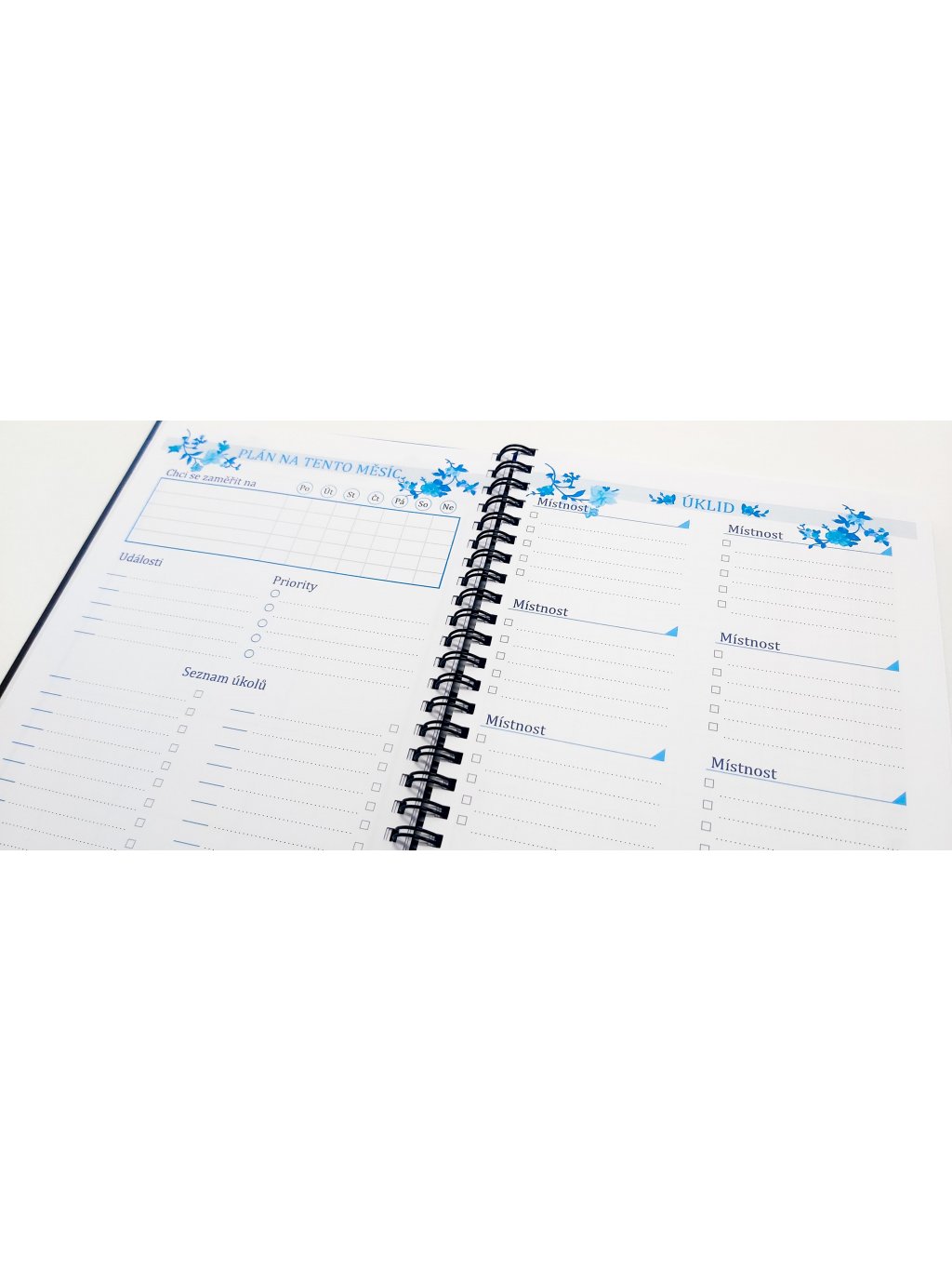 - Měsíc - měsíční přehled, díky kterému budete mít vše přehledně na dvojstraně, plán na tento měsíc (události, priority, úkoly), úklid, Moje rituály (Vaše rituály, kterým se chcete daný měsíc věnovat), Spánek a nálada (prostor pro sledování délky a kvality Vašeho spánku a Vaší nálady), Moje ráno (ranní zamyšlení, abyste začali den pozitivně), Týdenní přehled