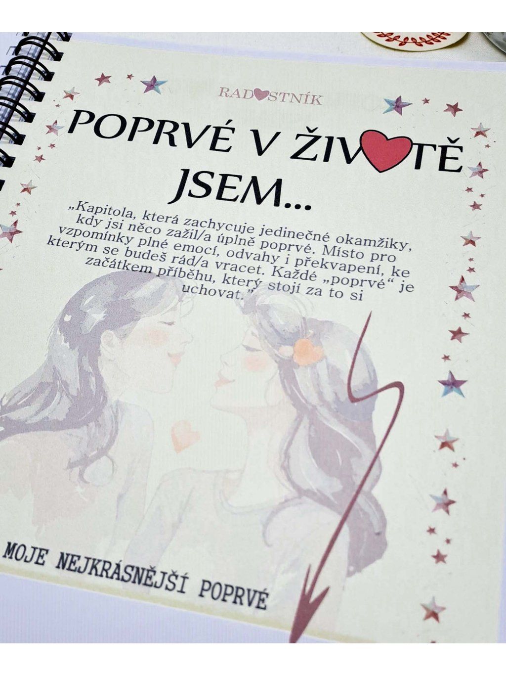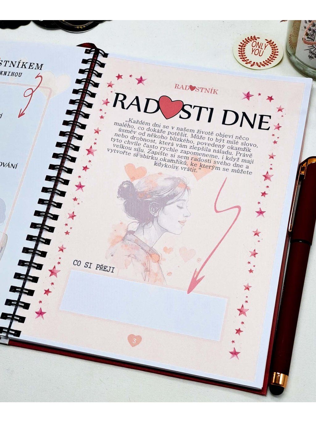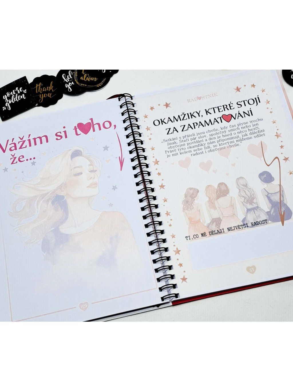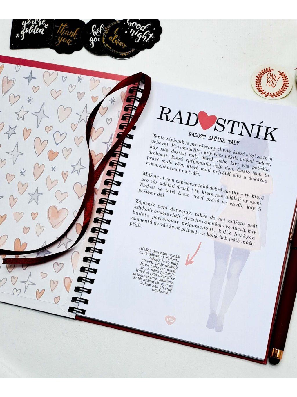 Radostník je víc než jen zápisník – je to váš osobní prostor plný radosti, emocí a krásných vzpomínek. Jemný design v růžových a červených tónech, doplněný o motivy srdíček, slečen a přátelství, vás naladí na pozitivní vlnu pokaždé, když ho otevřete.