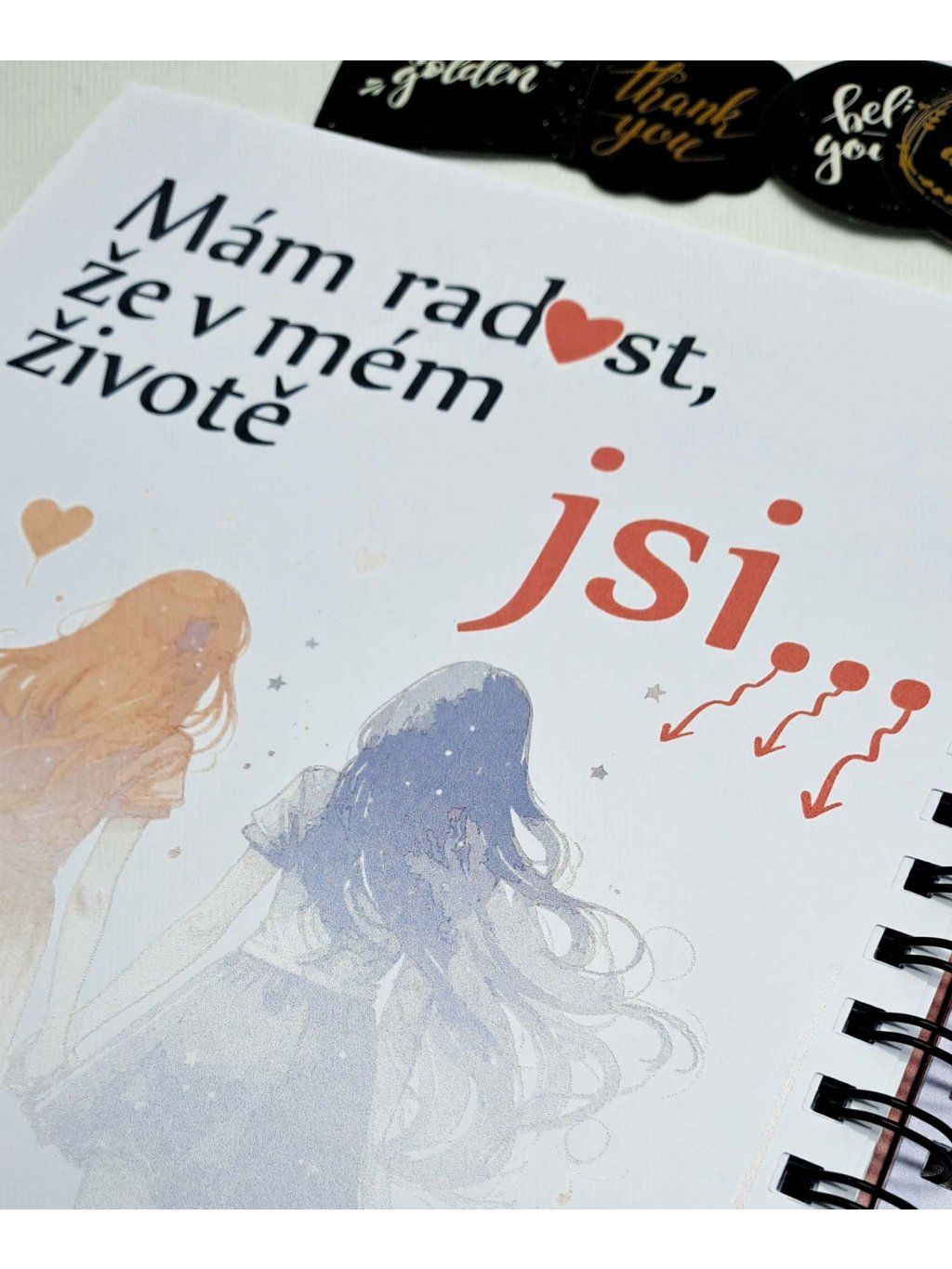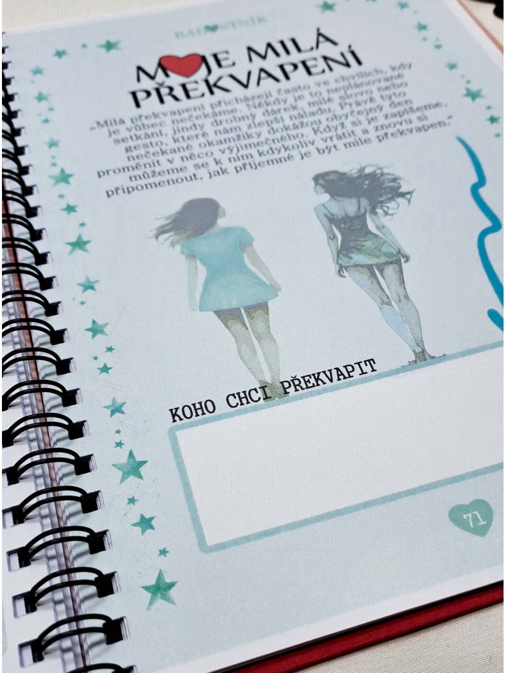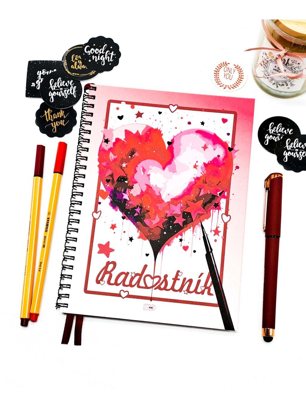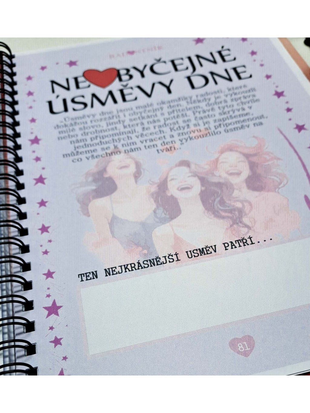 Radostník je víc než jen zápisník – je to váš osobní prostor plný radosti, emocí a krásných vzpomínek. Jemný design v růžových a červených tónech, doplněný o motivy srdíček, slečen a přátelství, vás naladí na pozitivní vlnu pokaždé, když ho otevřete.